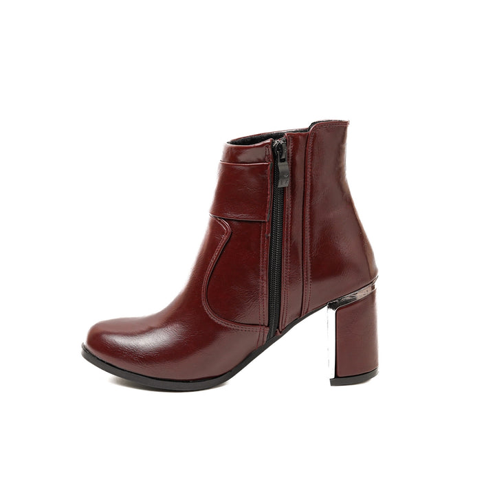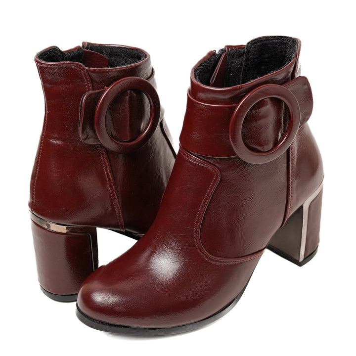 The side zipper closure ensures easy slip-on wear, while the decorative buckle detail enhances the overall look with a trendy edge. Designed with a sturdy sole and cushioned interior, these boots offer all-day comfort, making them a versatile choice for both casual and semi-formal occasions.